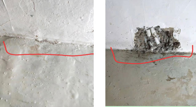 經(jīng)現(xiàn)場勘查樣板房負(fù)一層車庫部位積水嚴(yán)重,將積水清掃后觀察,發(fā)現(xiàn)多處滲漏點(diǎn)。