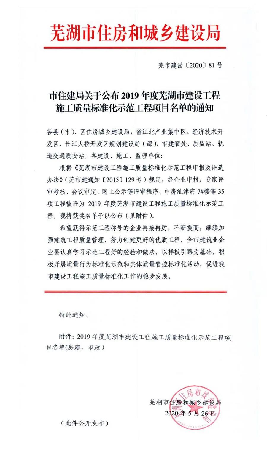 此次評選是根據《蕪湖市建設工程施工質量標準化示范工程申報及評選辦法》(蕪市建通知[2015]129號)規定,經企業申報、專家評審考核、會議審定、網上公示等評審程序。