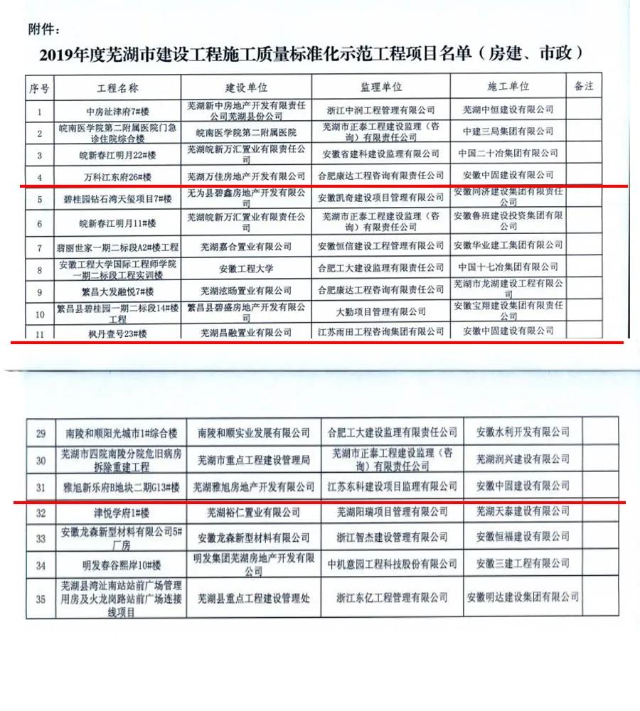近日,蕪湖市住建局公布了2019年度蕪湖市建設工程施工質量標準化示范工程名單,蕪湖在建的“萬科·江東府、融創昌建·楓丹壹號、旭輝雅居樂·新樂府”等三個項目均榜上有名,實現了“逢建必優大滿貫”!
