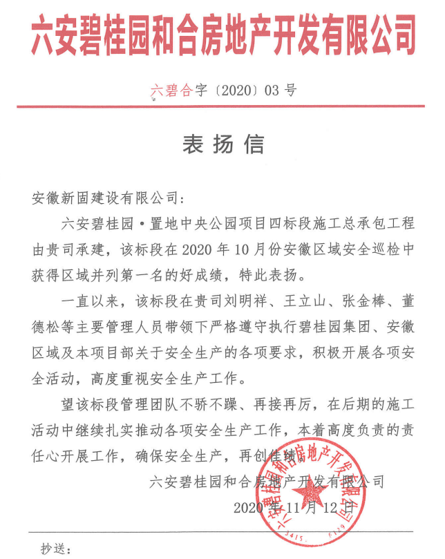 在2020年度第二季度新城控股集團合肥區域公司第三方土建過程評估中,該項目排名第一,項目經理洪欣榮獲新城控股皖南城市公司優秀項目經理。