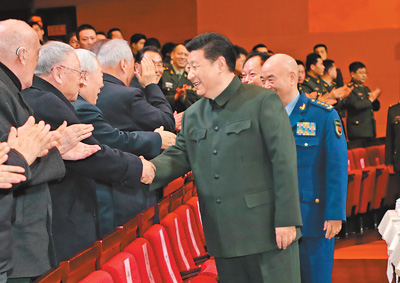 下午4時(shí)許,習(xí)近平來到老同志中間,全場響起熱烈掌聲。習(xí)近平同大家親切握手,關(guān)切詢問他們的身體和生活情況,共同回顧黨的十八大以來黨、國家、軍隊(duì)事業(yè)取得的歷史性成就、發(fā)生的歷史性變革。老同志們很振奮,一致表示要更加緊密地團(tuán)結(jié)在以習(xí)近平同志為核心的黨中央周圍,全面深入貫徹黨的十九大精神,以習(xí)近平新時(shí)代中國特色社會主義思想為指導(dǎo),貫徹習(xí)近平強(qiáng)軍思想,牢固樹立“四個(gè)意識”,自覺堅(jiān)定“三個(gè)維護(hù)”,滿懷信心迎接強(qiáng)國強(qiáng)軍新時(shí)代。