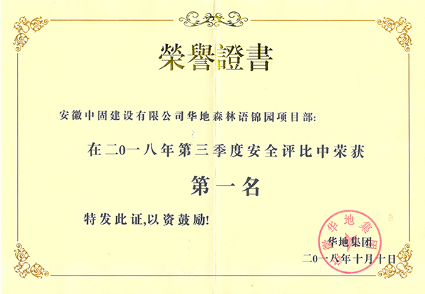 近日,安徽中固建設有限公司?華地森林語錦園項目以總分96.4分的高分,榮獲華地集團2018年三季度“安全競賽評比活動”第一名。